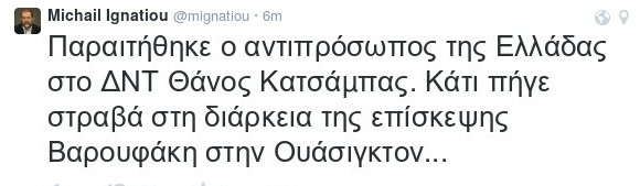 «Παραιτήθηκε ο αντιπρόσωπος της Ελλάδας στο ΔΝΤ Θάνος Κατσάμπας. Κάτι πήγε στραβά στη διάρκεια της επίσκεψης Βαρουφάκη στην Ουάσιγκτον...»
