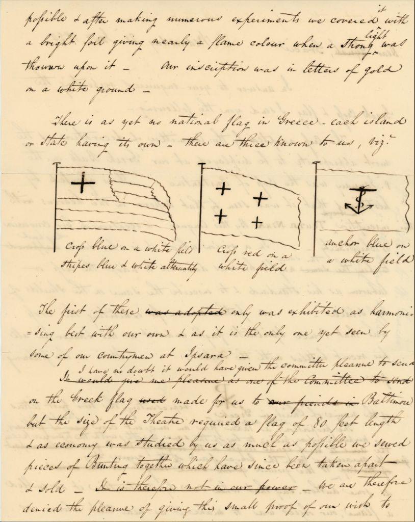 Τότε, πρώτη ίσως φορά, σχεδιάζεται επί χάρτου με σινική μελάνη η ελληνική σημαία, όπως επισημαίνει μιλώντας στο ΑΠΕ-ΜΠΕ ο συλλέκτης – διεθνής κριτής, Γιώργος Θωμαρέης.